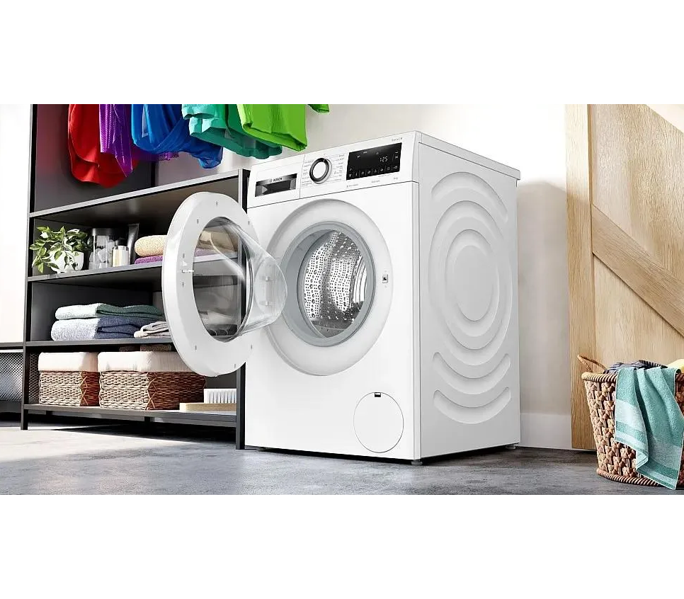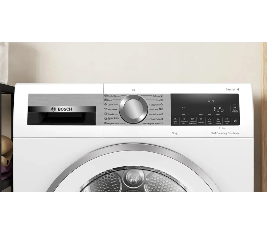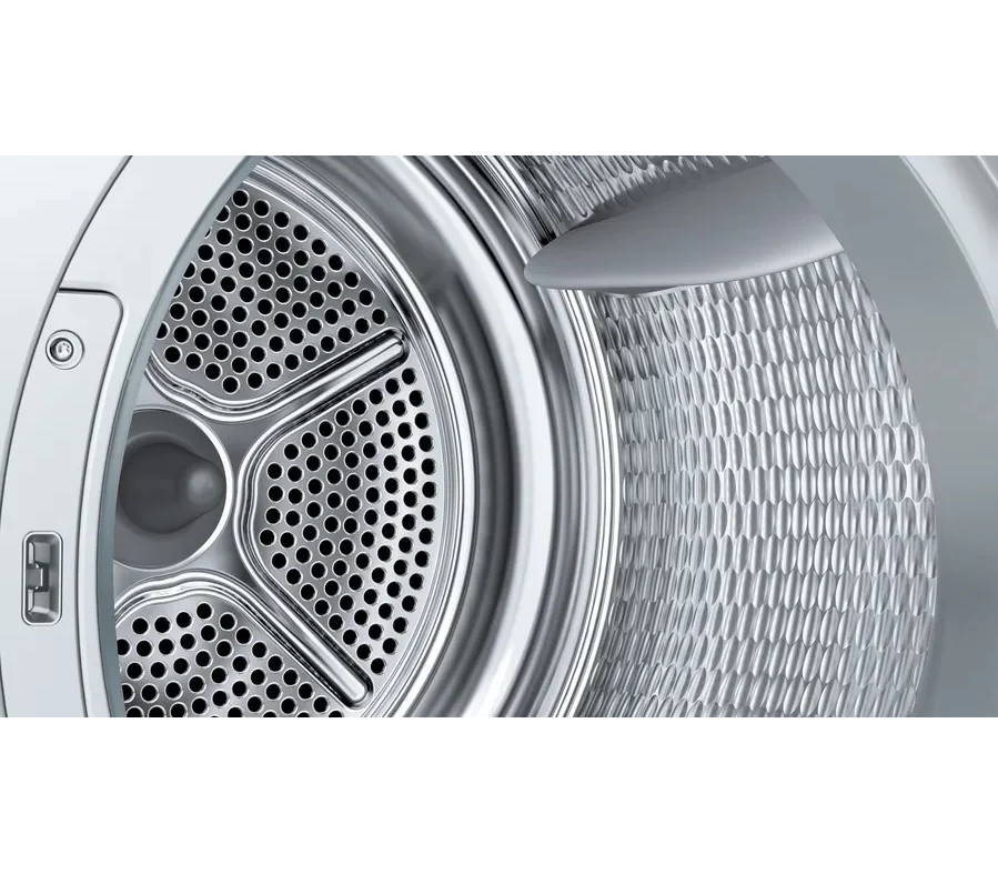 Сушильная машина Bosch WQG24591BY сочетает лаконичную белую отделку с продуманными линиями корпуса и декоративными элементами, которые делают прибор уместным в любом интерьере. Панель управления выполнена в современном электронном стиле: крупный многофункциональный LED-дисплей даёт ясную информацию о ходе цикла и оставшемся времени, а комбинация поворотного переключателя и сенсорных Touch control обеспечивает интуитивное управление. Дверца с навесом справа открывается плавно, упрощая загрузку и выгрузку белья, а внутренняя подсветка барабана из нержавеющей стали позволяет контролировать состояние ткани в процессе высушивания. Боковые панели с дизайном AntiVibration сокращают вибрацию и шум, делая работу менее заметной в жилом пространстве.