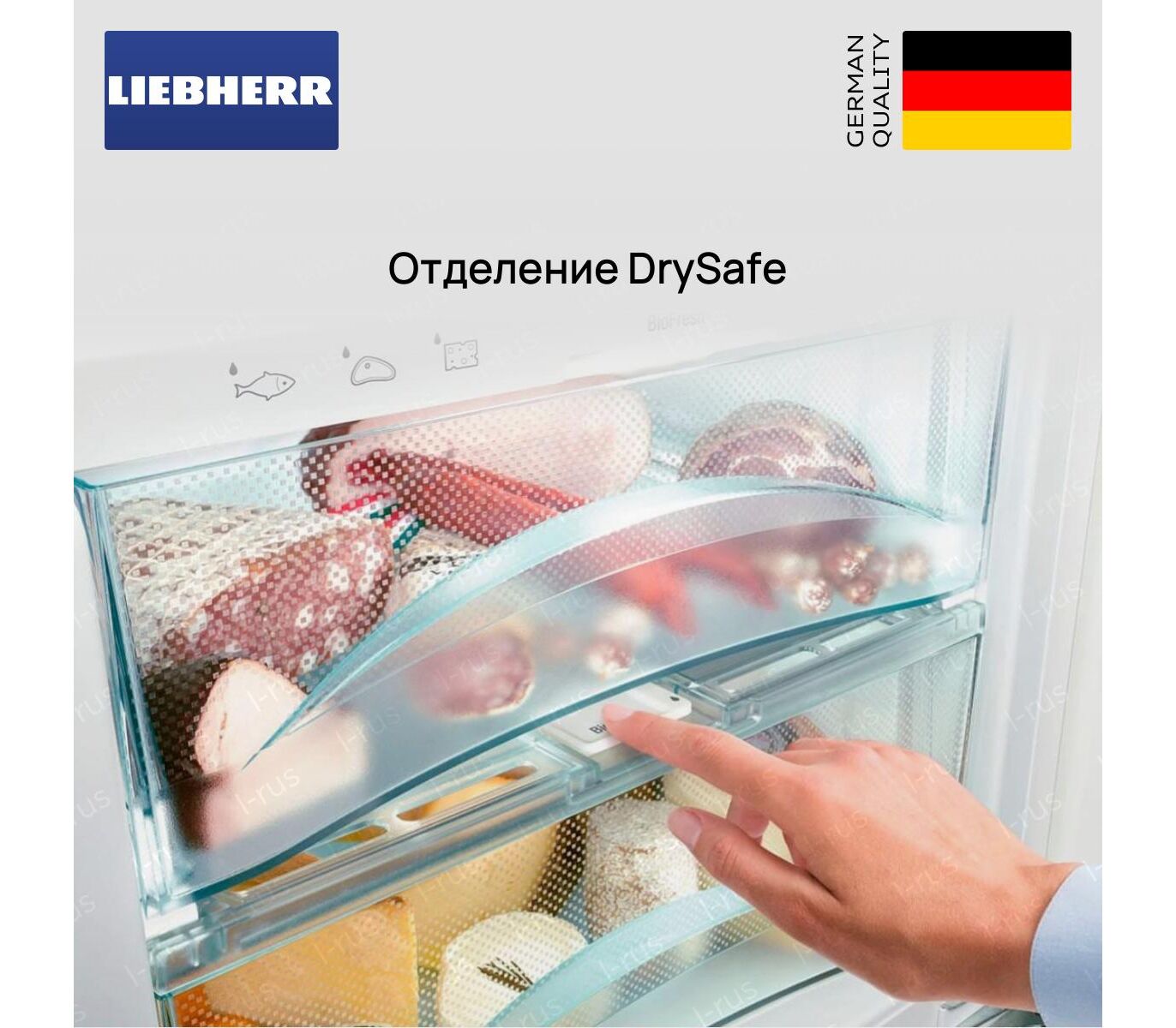 - В камере находятся 7 полок, есть складная двойная, переставляемый контейнер VarioSafe, бутылочница, зона свежести на 2 закрытых контейнера с пониженной температурой и разной влажностью.