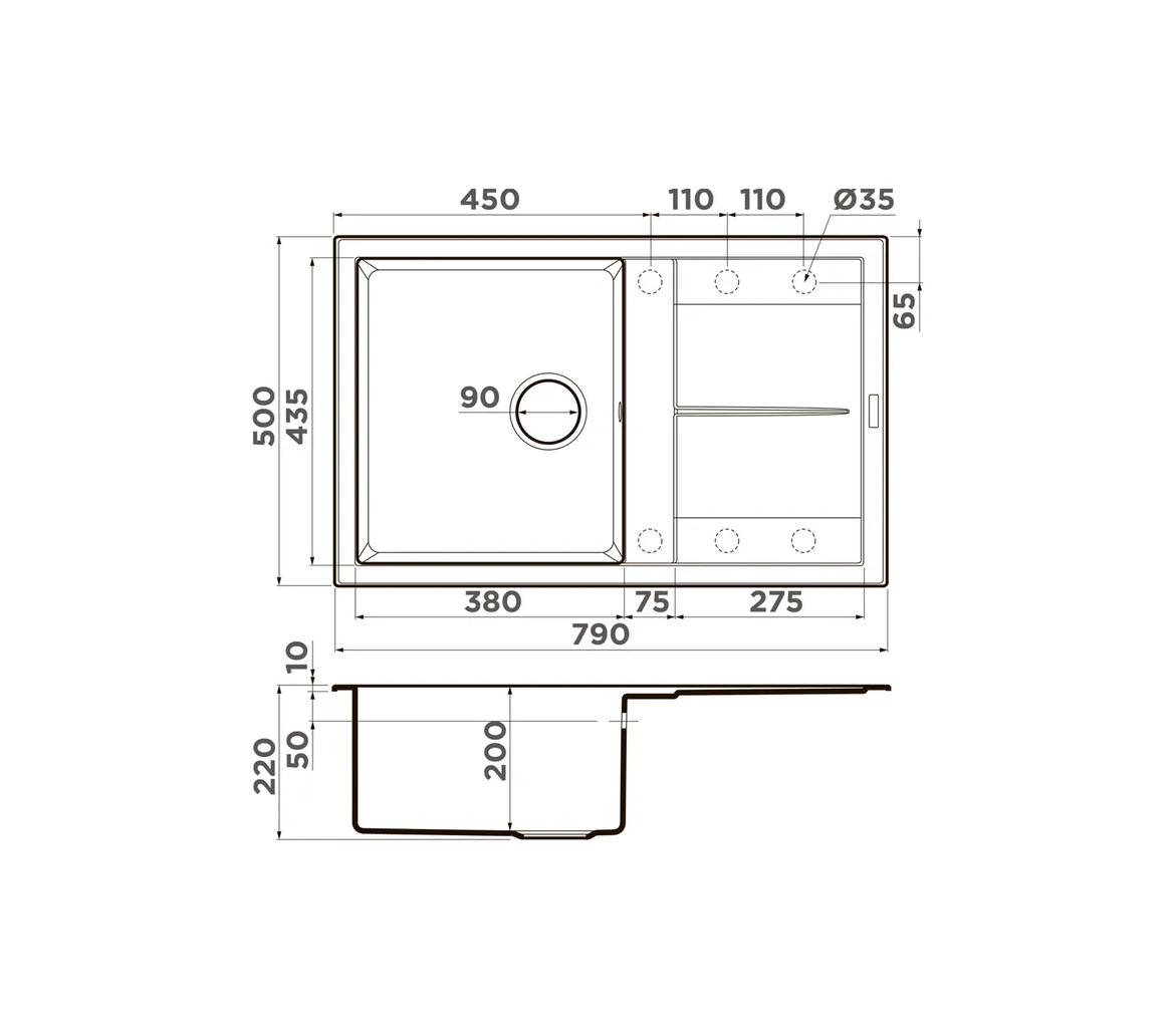 Размер выреза под мойку, мм: 480*770