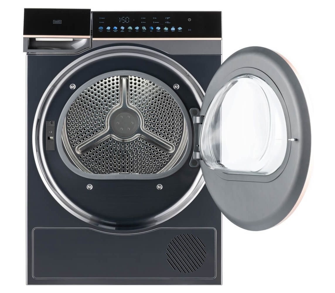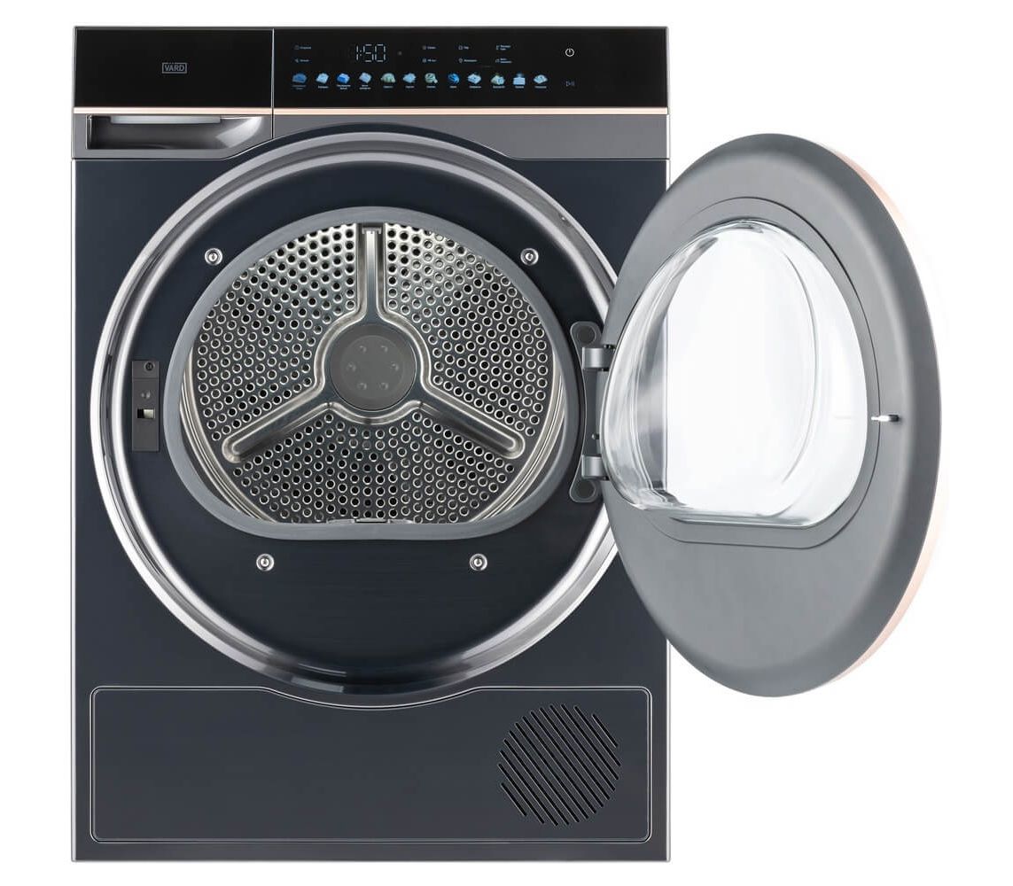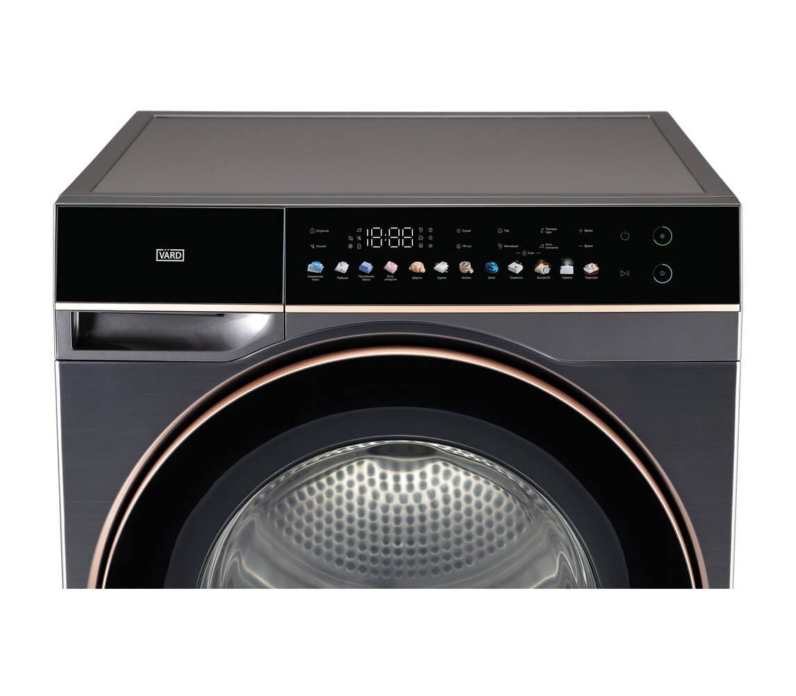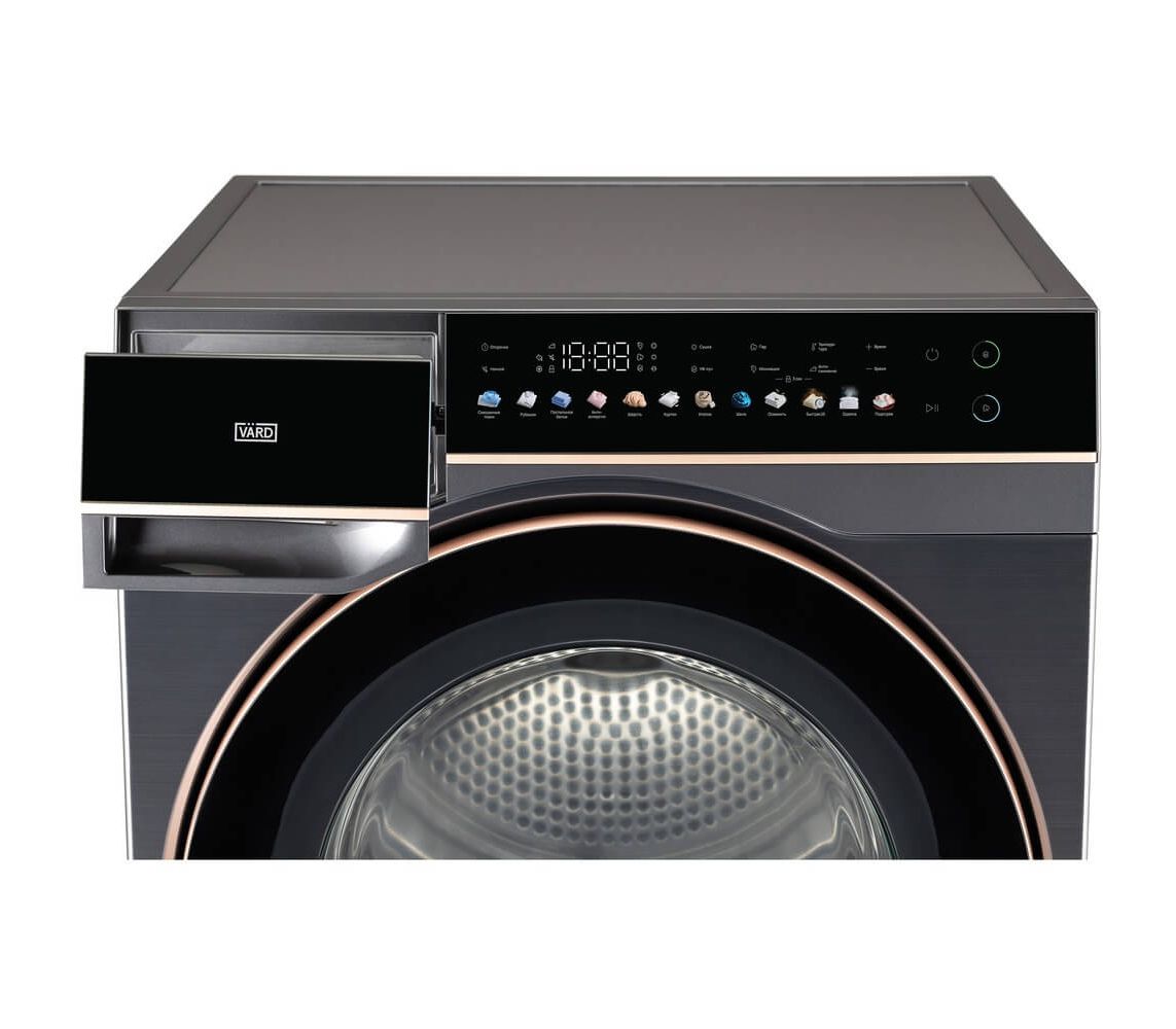 Сушильная машина серого цвета с эксклюзивной медной отделкой, максимальной загрузкой 10 кг и технологией сушки Heat pump сочетает в себе лаконичный дизайн и передовые технологии.