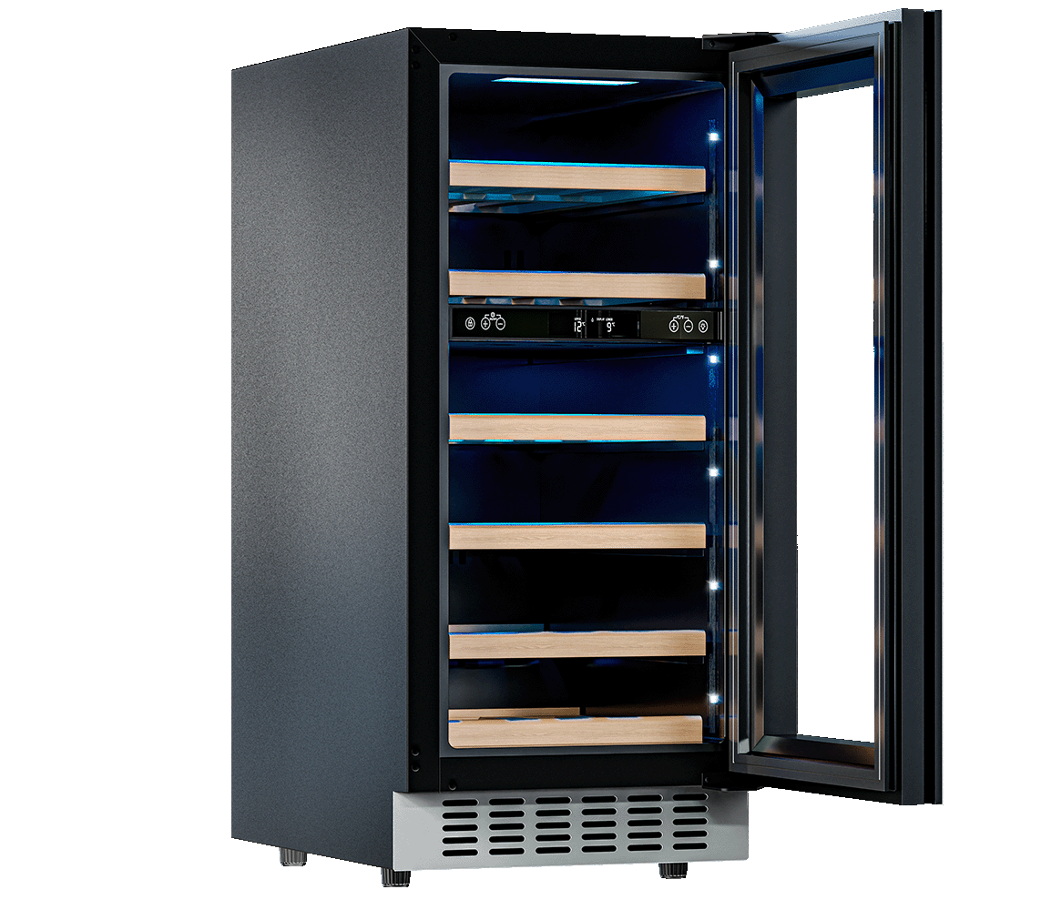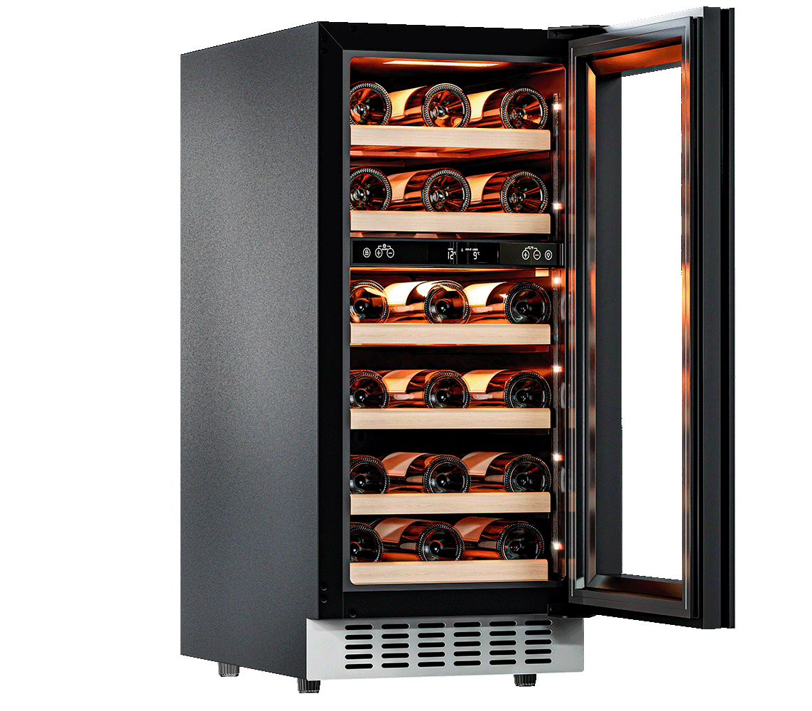 Компрессорный винный шкаф Meyvel MV28NH-KWT2 обладает большой вместимостью и даёт возможность разместить до 28 бутылок стандартного типа Бордо (0,75 л). Располагаются они на выдвижных полках из дерева. Внутреннее пространство шкафа разделено на 2 температурные зоны, с возможностью настраиваить каждую из них. Общий диапазон температуры у данной модели от +5°C до +20°C.