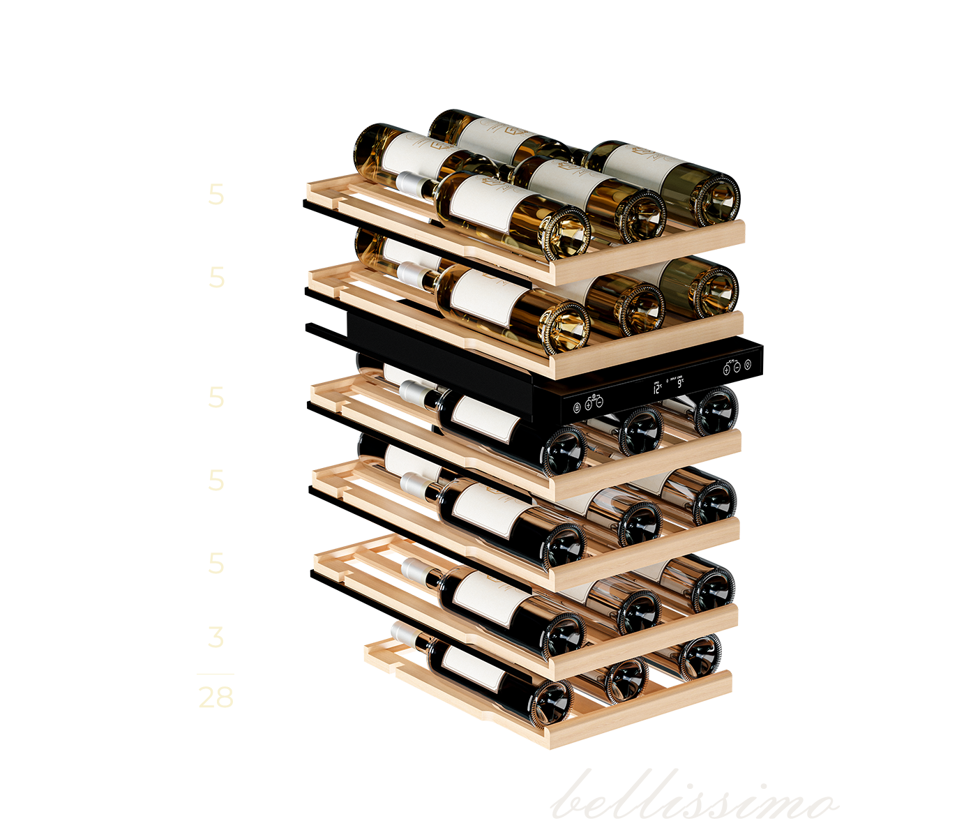 - Вместимость 28 бутылок стандартного типа Бордо (0,75 л);