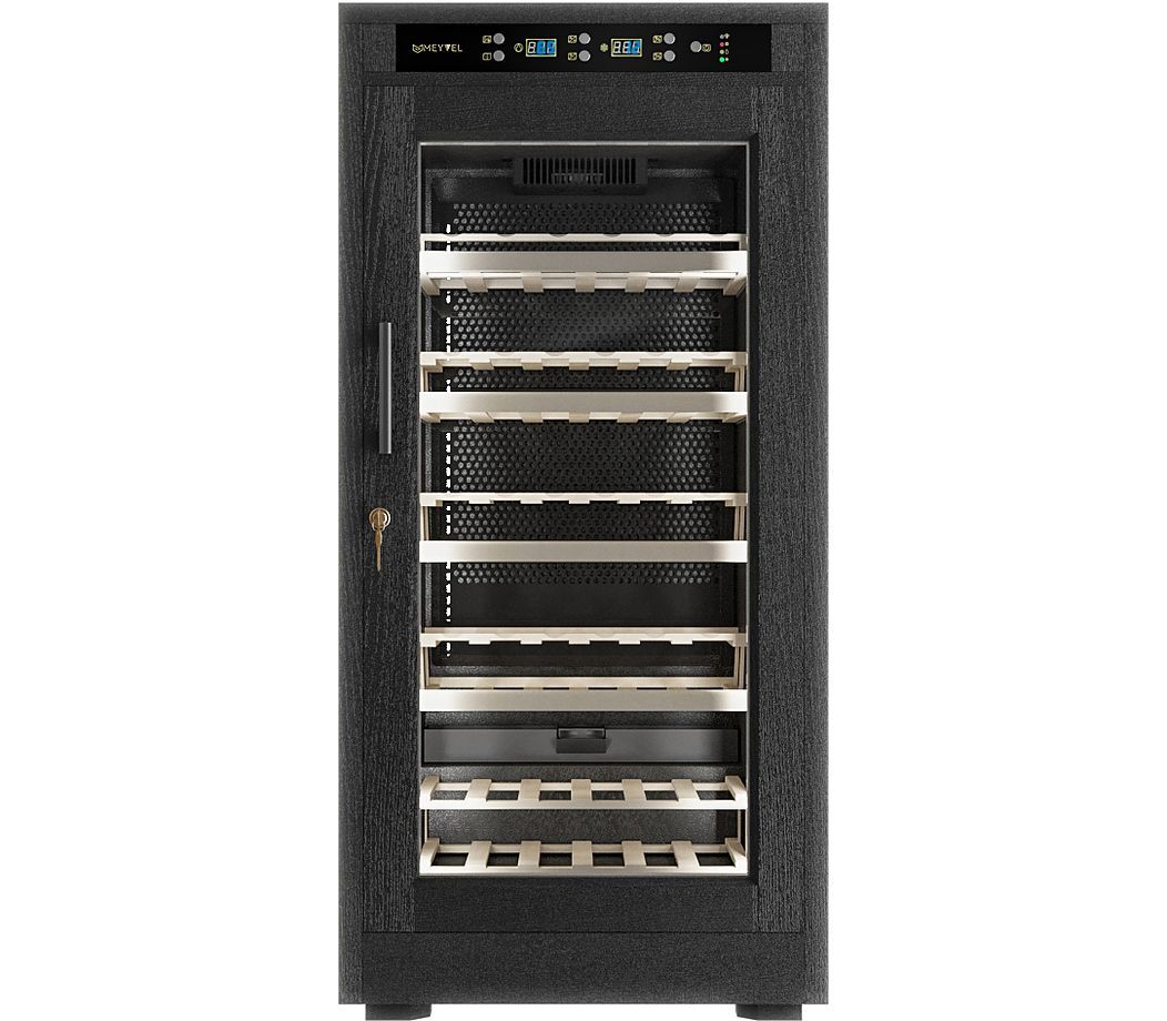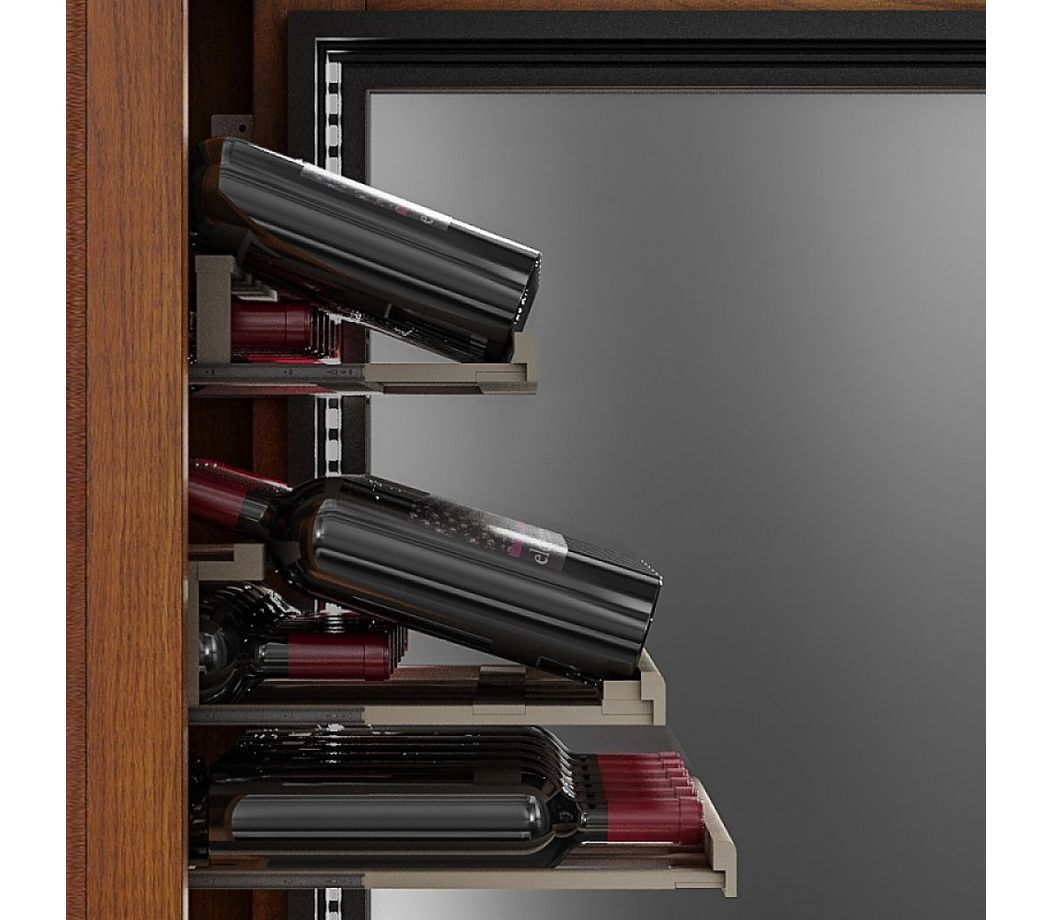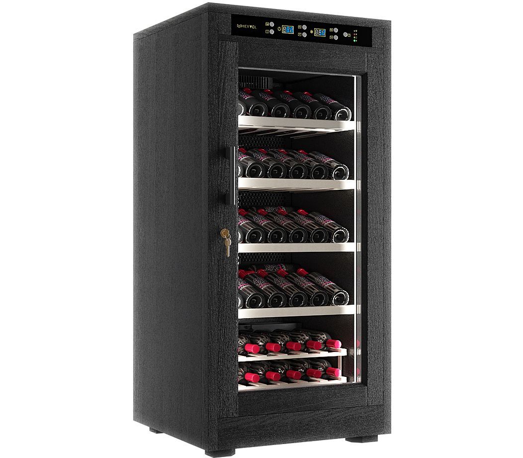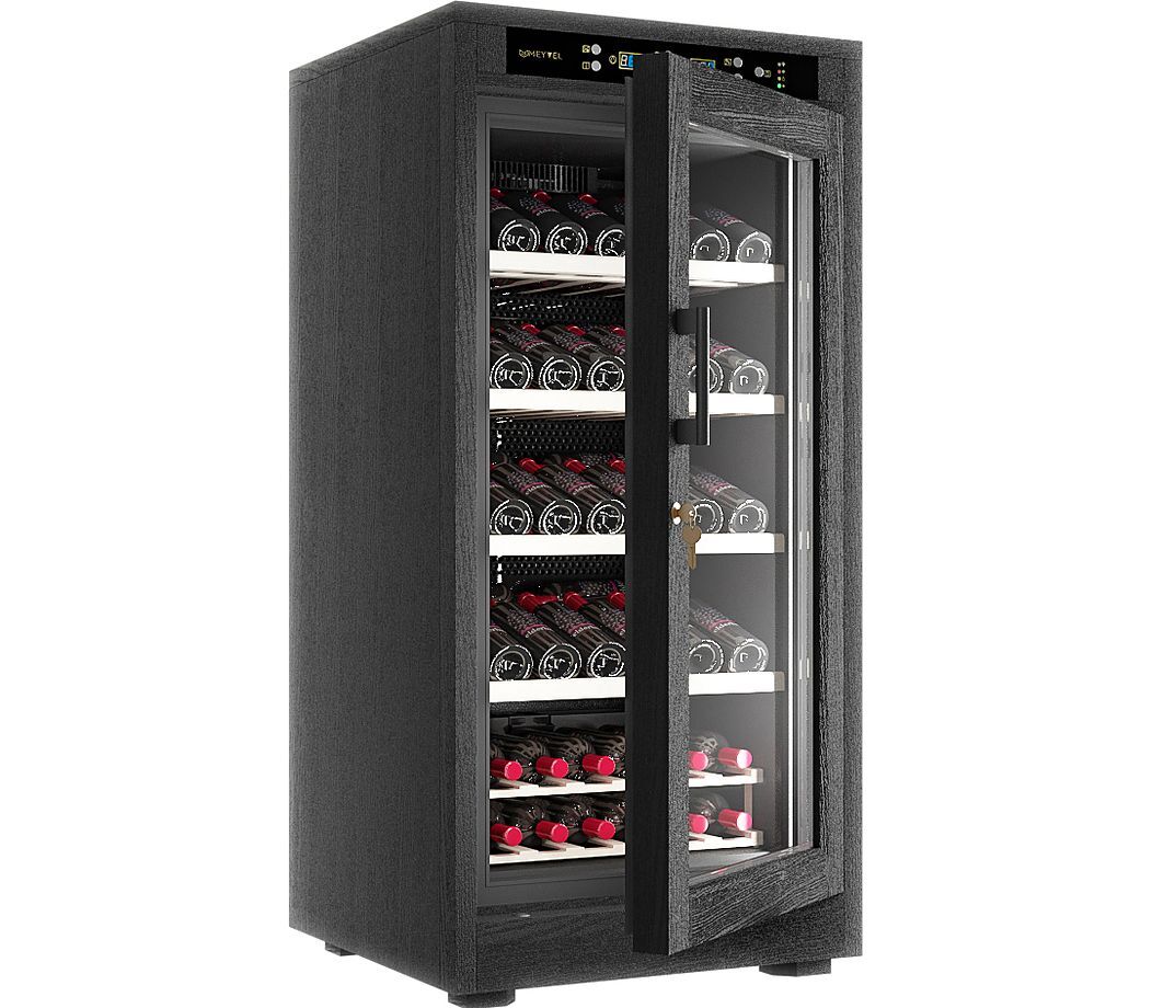 Винный шкаф предназначен для демонстрации, хранения и создания оптимальных условий для сохранения всех вкусовых свойств вина в бутылках на предприятиях общественного питания, торговли, в барах, ресторанах, специализированных магазинах, частных домах или квартирах. Модель оснащена сенсорной панелью управления, электронным термостатом и светодиодной подсветкой. Корпус выполнен из обшитой деревом стали, дверь - из деревянной рамы и двойного стекла с защитой от ультрафиолетовых лучей, полки - из массива бука, ручка двери - черного цвета.