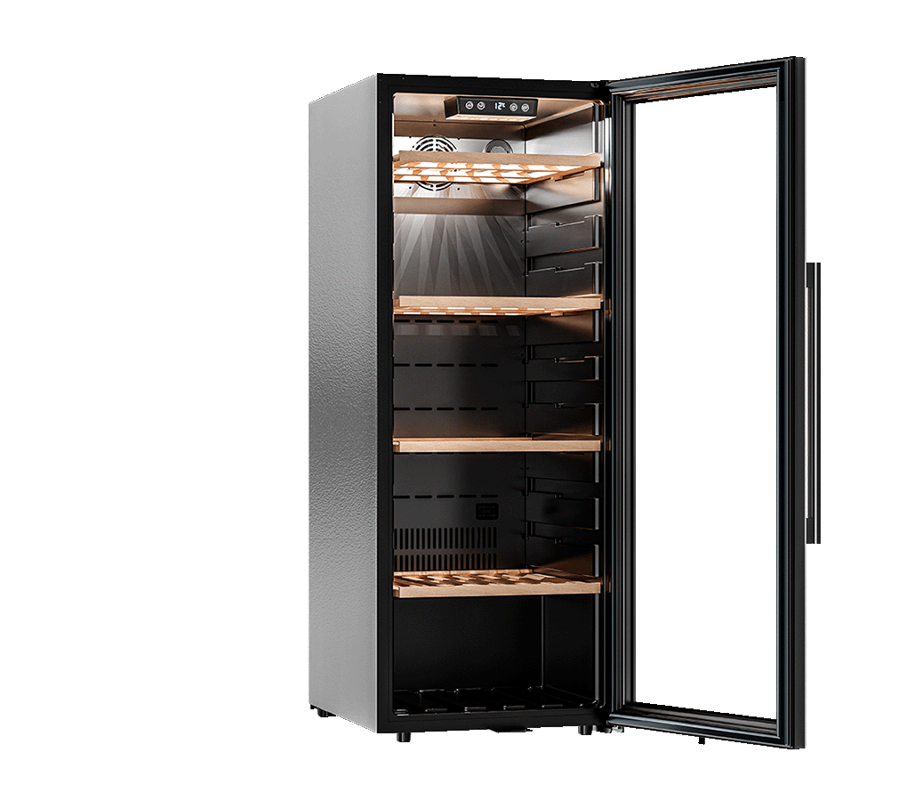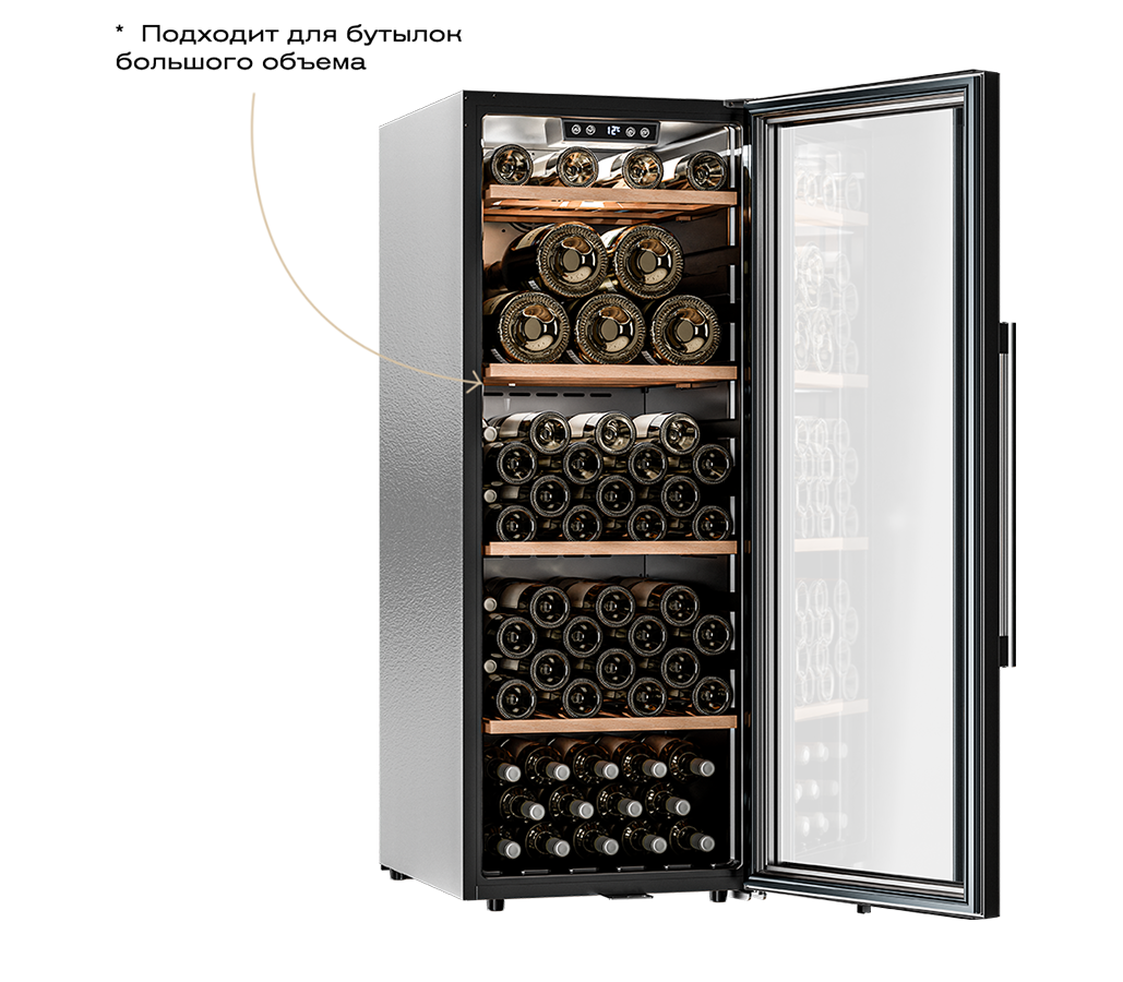 Устройство поддерживает температуру от +5 до +20°C, что прекрасно подходит для всех типов вин. Дизайн шкафа продуман так, что он без проблем вмещает не только стандартные бутылки объемом 0,75 л, но и более крупные емкости. Бутылки также устанавливаются стоя.