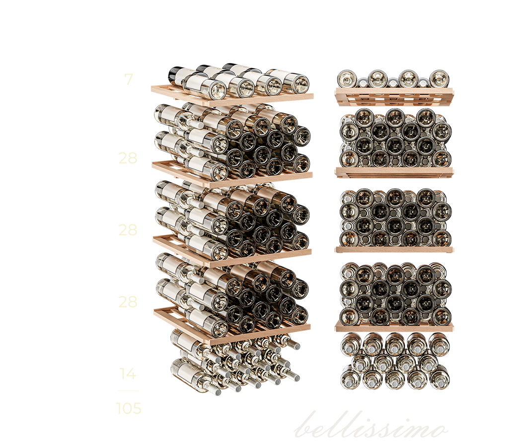 Винный шкаф комплектуется четырьмя деревянными полками, которые не только красиво выглядят, но и способствуют хорошей циркуляции воздуха. Дополнительно устанавливается до 6 полок, а также можно приобрести демонстрационную полку и полку для фужеров. Двойное стекло с UV-фильтром защищает вино от вредного света, сохраняя его вкус и аромат.