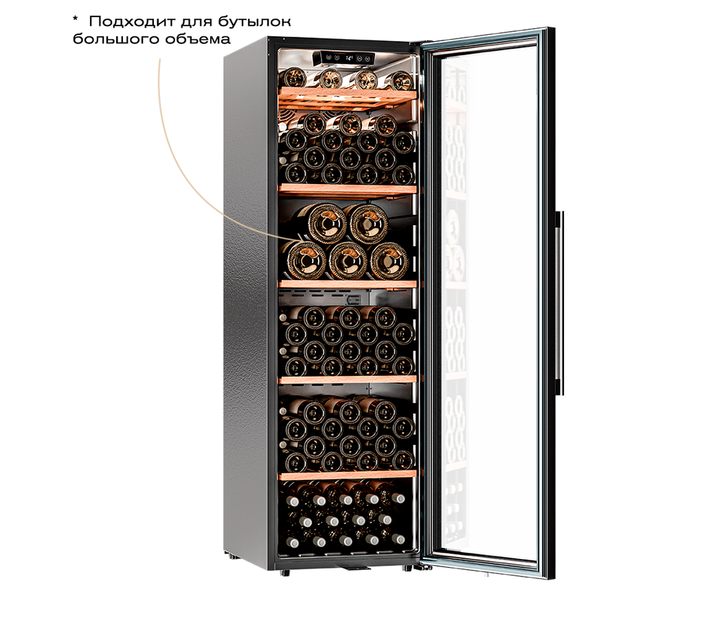 Устройство поддерживает температуру от +5 до +20°C, что прекрасно подходит для всех типов вин. Дизайн шкафа продуман так, что он без проблем вмещает не только стандартные бутылки объемом 0,75 л, но и более крупные емкости. Бутылки также устанавливаются стоя.