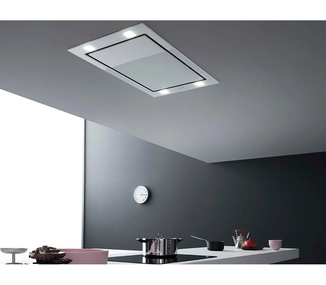 Дизайн. Вытяжка Falmec Design+ SIRIO 90 WHITE (потолочная) — модель в стиле hi-tech с фронтальной поверхностью из белого стекла. Четыре светодиодные лампы хорошо освещают рабочее пространство. Модель поставляется без мотора. Функционал. Металлические жироулавливающие фильтры защищают двигатель от крупных частиц загрязнений. Угольные фильтры приобретаются вместе с внешним мотором конфигурации Slim.