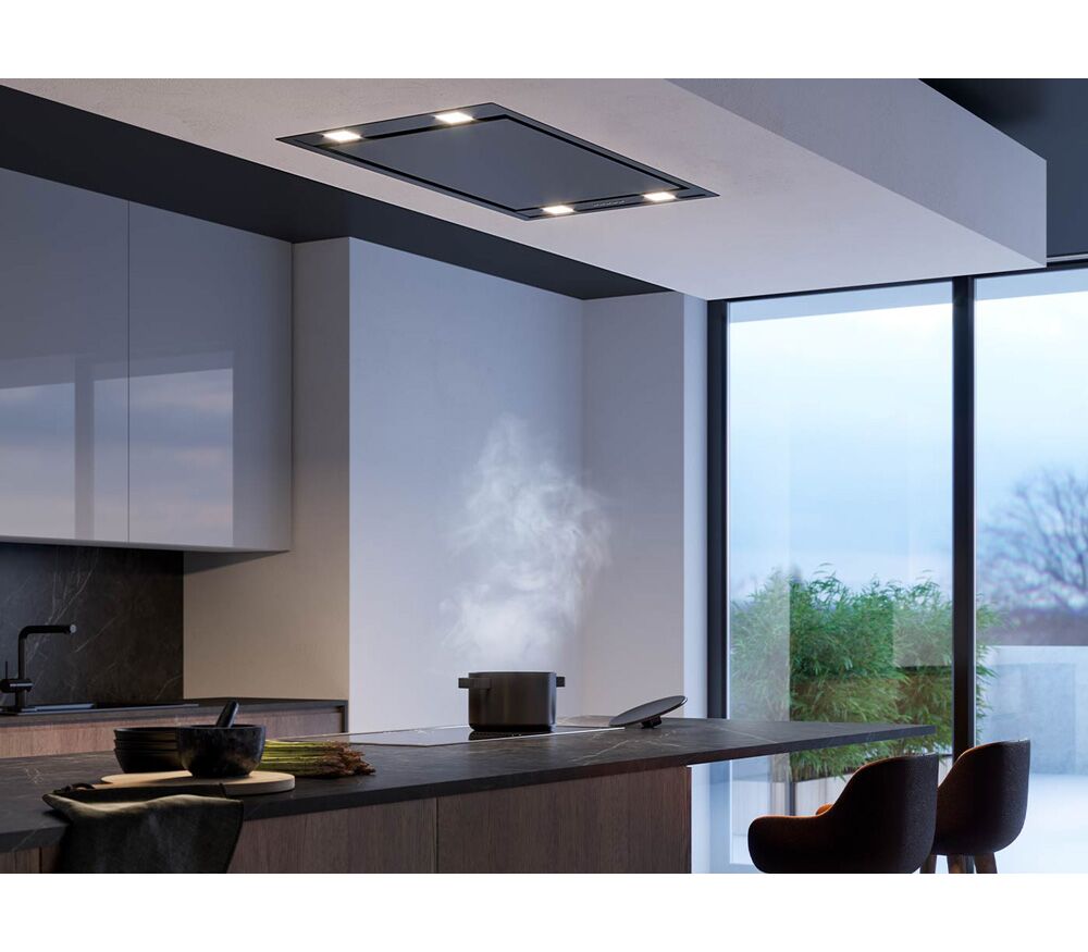 Корпус изготовлен из нержавеющей стали AISI 304, что обеспечивает долговечность и простоту ухода. Черный цвет придает модели современный и элегантный вид. Потолочный тип монтажа позволяет максимально эффективно использовать пространство кухни, особенно если она имеет ограниченные размеры.