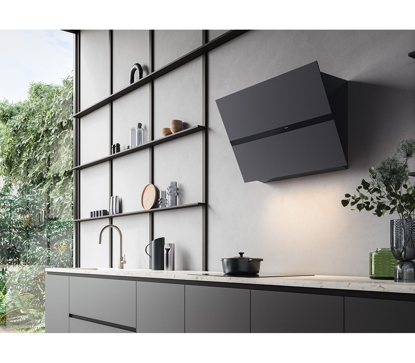 Настенная вытяжка Falmec FUSION 85 bk, выполненная в черном стекле, представляет собой новое решение в категории наклонных вытяжек. Ее строгий дизайн акцентируется геометрическими линиями и сатинированным стеклом, предлагая стильный контраст с полированной рамкой и сенсорной панелью управления. Вытяжка оснащена LED-подсветкой с возможностью регулировки цветовой температуры, что создаёт отличные условия для приготовления пищи.