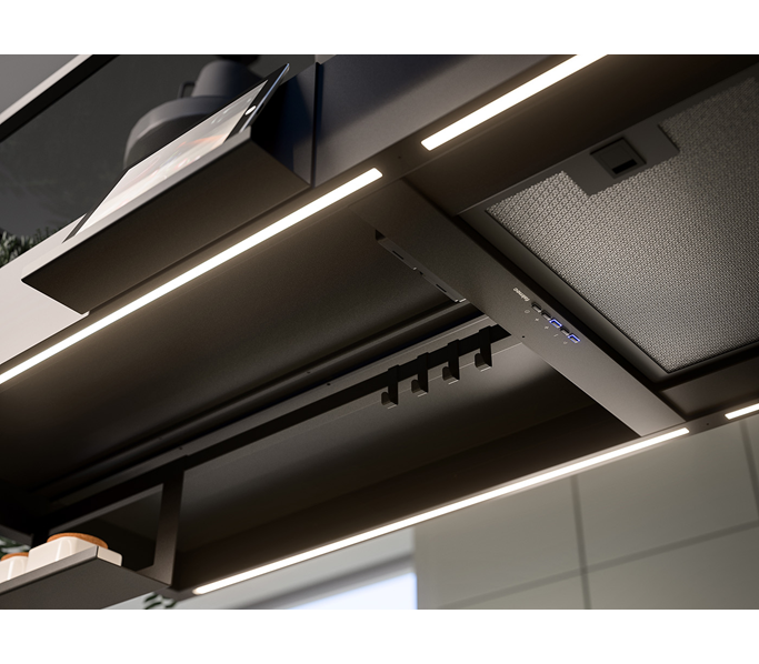 - Прибор объединяющий в себе вытяжку с системой фильтрации Carbon.Zeo и многофункциональным комплексом, в котором у хозяйки есть возможность подключения планшета, миксера, бытовой техники (розетка + USB)