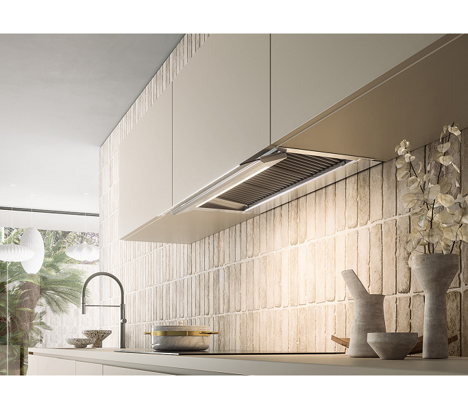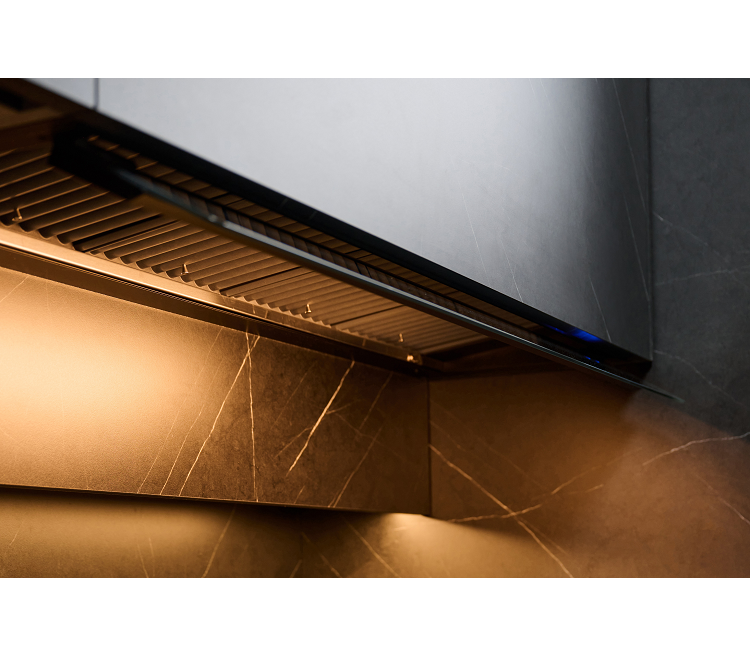 - Сенсорное управление на откидном козырьке,который отсекает пар от фасада кухонного шкафа.