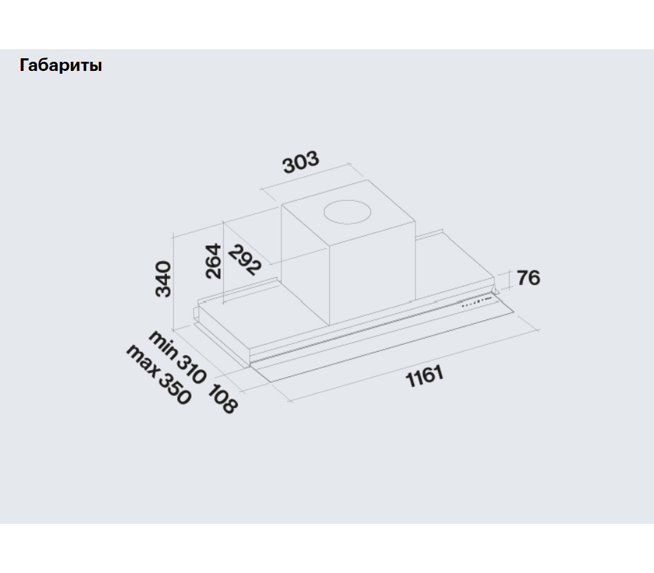 | Мотор и управление | 800 м³/ч (I.E.C.61591) 1280 м³/ч (максимальная производительность) 4 скорости, сенсорный тип управления |