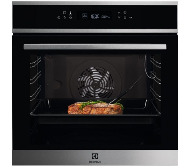 Духовой шкаф Electrolux EOE7C31X имеет термозонд с помощью него вы можете убедиться в приготовлении мяса. Есть каталитическая очистка, происходит нагрев до 250 градусов, после жир и грязь расщепляются, вам остается только протереть устройство. Благодаря режиму быстрый нагрев на 40 % времени быстрее происходит разогрев, для приготовления.