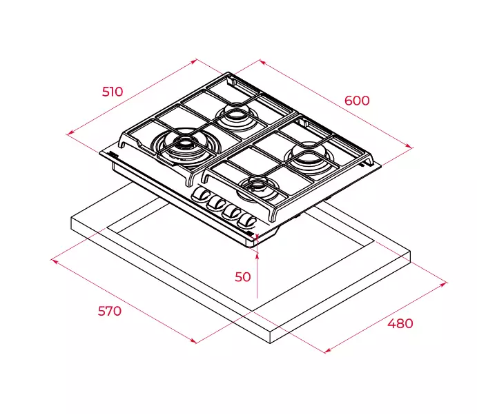 - 4 зоны приготовления: 1 двухконтурная горелка, 4,00 кВт, 1 средняя горелка (1,75 кВт), 1 ьыстрая горелка (2,8 кВт), 1 вспомогательная горелка (1,0 кВт)