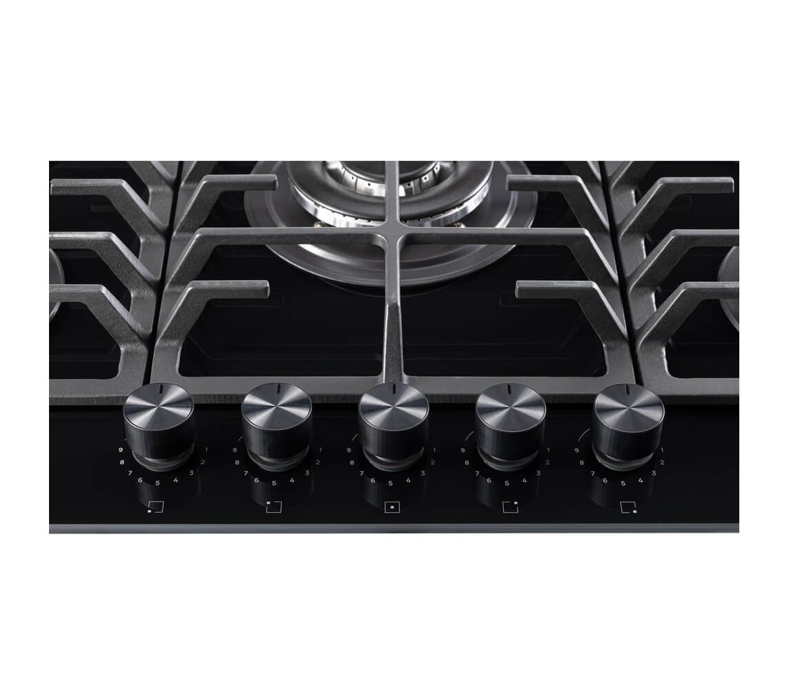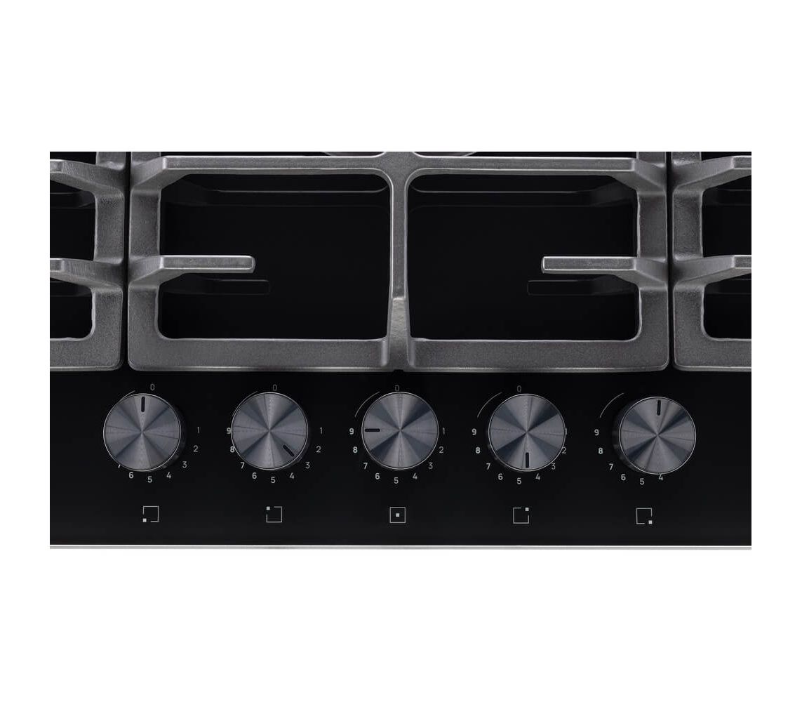 Газовая варочная панель, ступенчаные регуляторы StepFlame, на чёрном закалённом стекле, ширина 90см, чугунные держатели, газконтроль и автоматический автоподжиг, WOK конфорка, 5 конфорок,