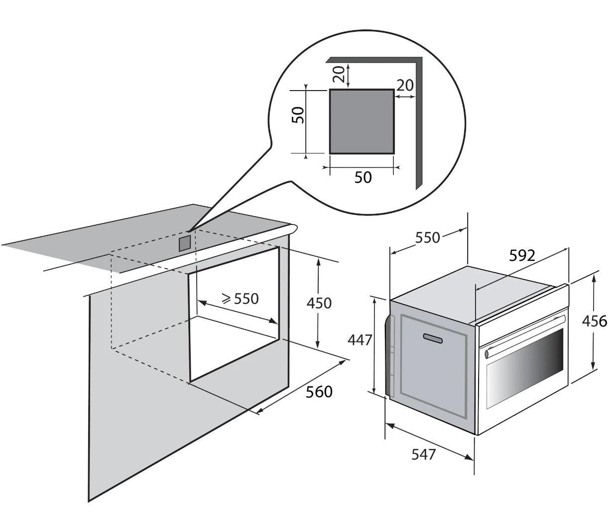 | Размеры ниши для встраивания ВxШxГ (мм) | 450X560X550 |