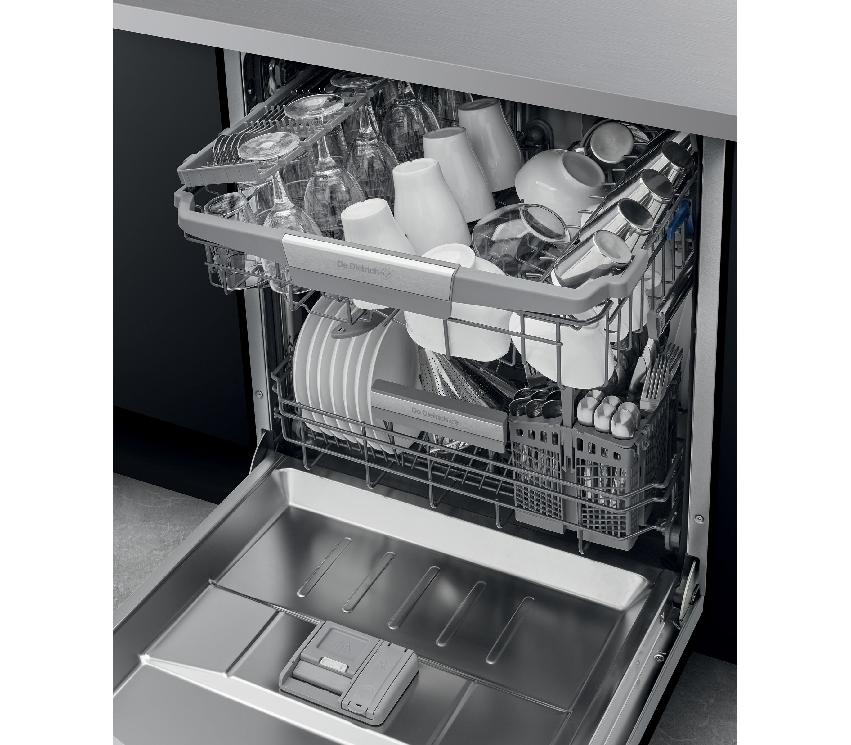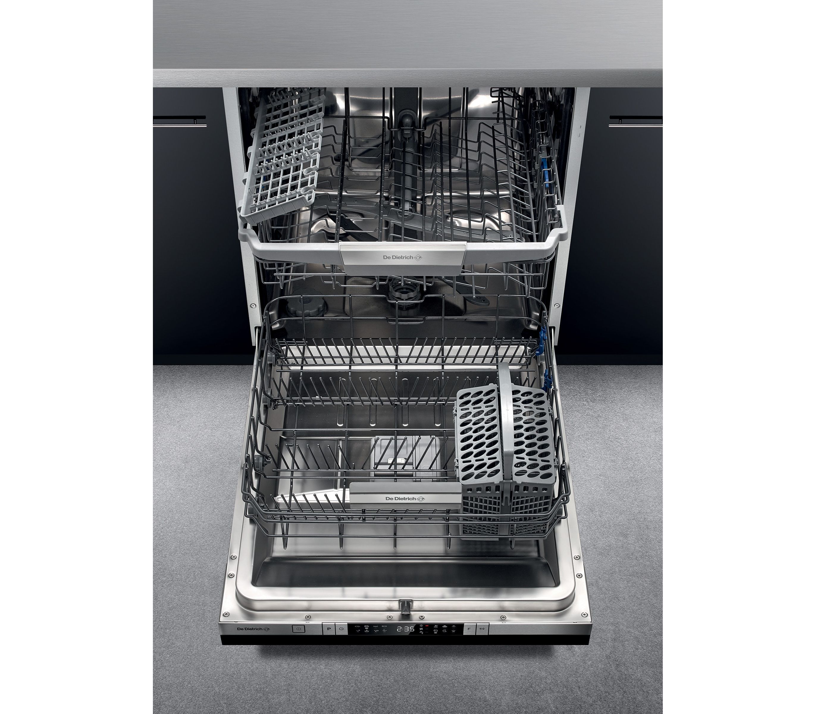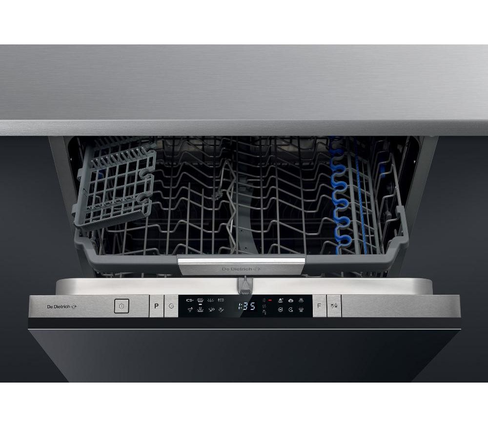Встраиваемая посудомоечная машина De Dietrich Управление осуществляется помощью нажимных кнопок, на дисплее отображается время до конца цикла мойки, наличие соли/ ополаскивателя, выбранный режим. Инверторный мотор более тихий, долговечный и энергоэффективный. Интеллектуальная система управления ICS + благодаря датчикам адаптирует на протяжении всего цикла все параметры мытья (продолжительность, воду, температуру) в зависимости от количества посуды и уровня ее загрязненности. Для безопасной эксплуатации предусмотрена система защита от протечек AquaBlock.