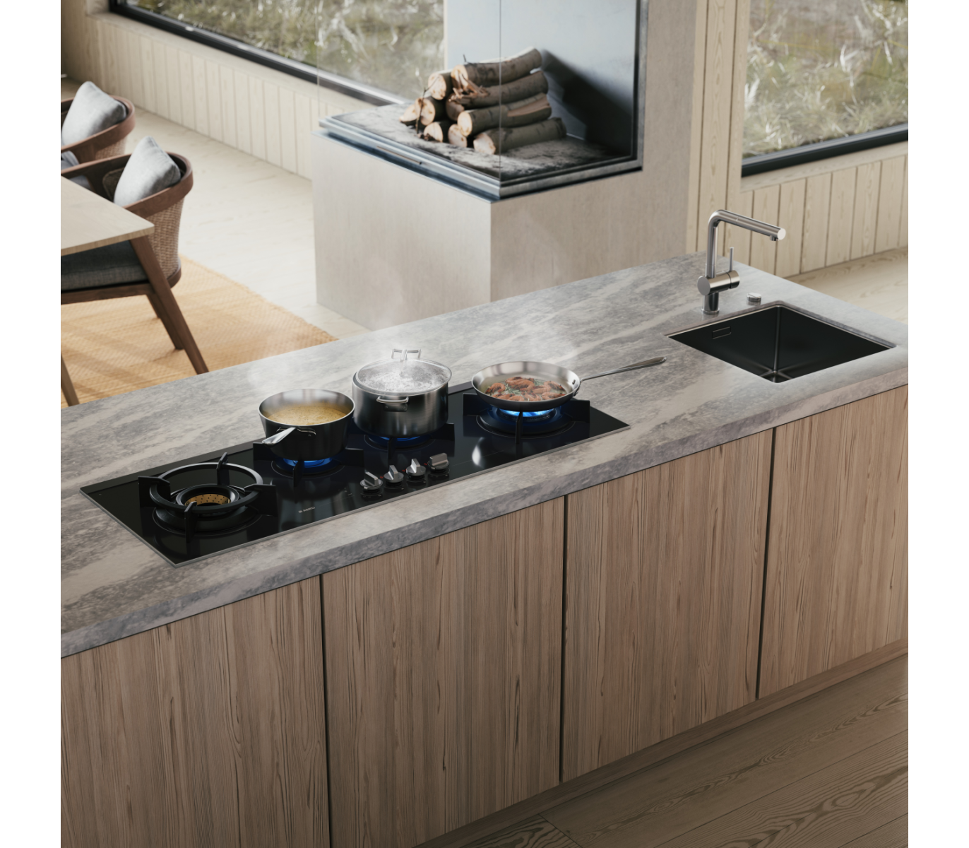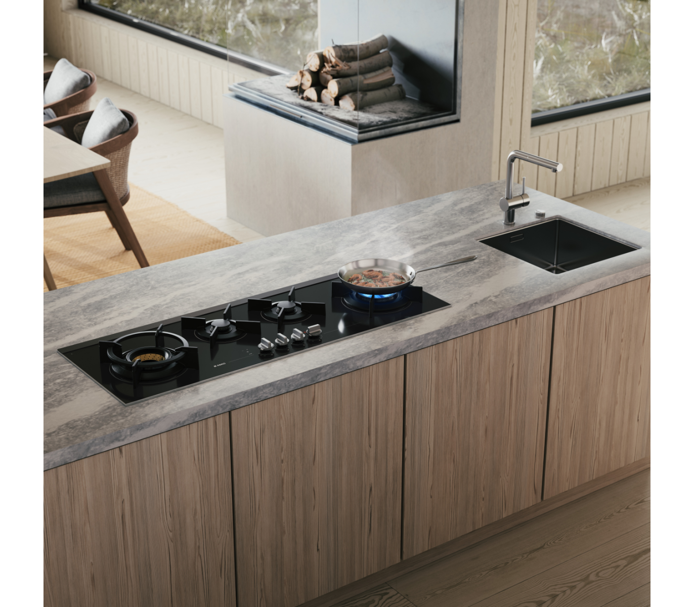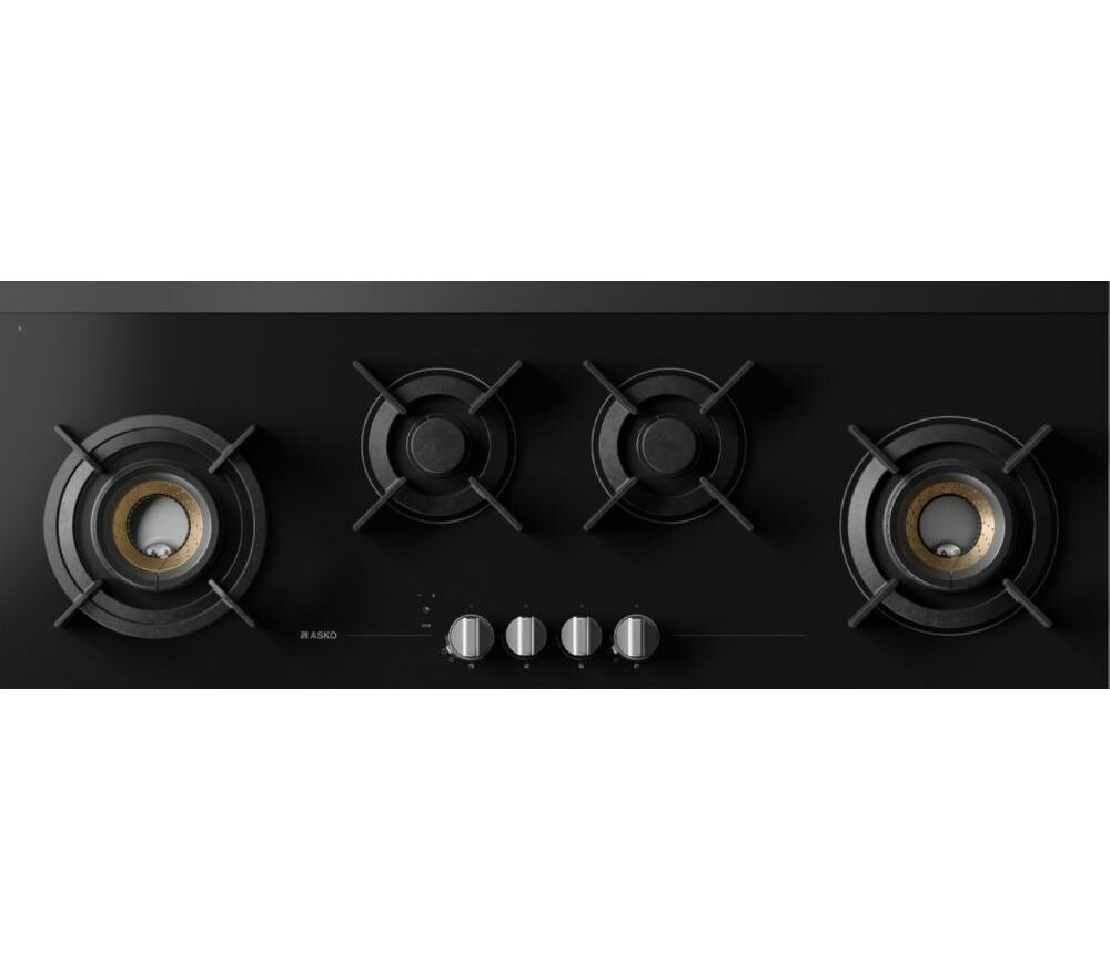 Варочная панель Asko HG8144BGB1 — удобная и современная, очень широкая, 111 сантиметров, с комфортным расположением четырех конфорок. Благодаря оригинальному размещению рабочих зон на варочной поверхности можно использовать крупногабаритные кастрюли и сковороды. Две горелки компактные, а две — большие, повышенной мощности, WOK Fusion Volcano. Это инновационная конфорка для вок-готовки. В отличие от обычных горелок, эта модель оснащена тремя рядами пламени, расположенными один под другим. Такая конструкция позволяет сосредоточить нагрев в центре, что не только увеличивает скорость приготовления, но и делает возможным использование традиционной вок-сковороды. Для удобства рекомендуется применять специальный держатель-насадку.