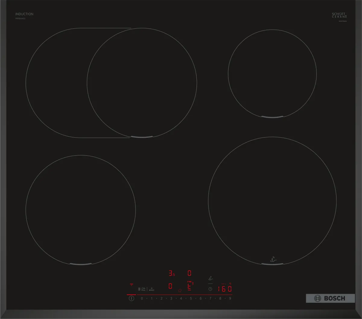 Индукционная варочная панель Bosch PIF651HC1E — это современное и функциональное решение для вашей кухни. Произведенная в Евросоюзе, эта модель обладает высоким качеством и надежностью. Панель имеет четыре конфорки, которые обеспечивают максимальное удобство при приготовлении пищи. Серия Serie | 6, которой принадлежит данная модель, известна своим стильным и современным дизайном. Компактные размеры панели — 59.2 см в ширину, 52.2 см в глубину и всего 5.1 см в высоту — позволяют встроить ее даже на небольшую кухню. При этом габариты ниши для встраивания составляют 56-56.2х49-50.2 см. Черный цвет и материал поверхности — стеклокерамика — придают модели элегантность и современность. Особенностью дизайна является скошенный край, который добавляет изящества и оригинальности. Управление панелью осуществляется с помощью сенсорных элементов, которые интуитивно понятны и удобны в использовании. Система управления DirectSelect обеспечивает простоту и комфорт при выборе необходимых настроек. Панель оснащена таймером прямого отсчёта с функцией отключения для каждой конфорки, что позволяет контролировать процесс приготовления пищи и избежать перегрева. Инновационная зона объединения CombiZone предоставляет возможность объединить две конфорки в одну большую, что дает больше гибкости при выборе посуды для приготовления.