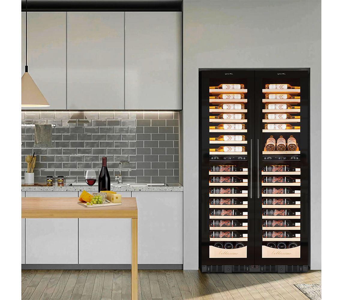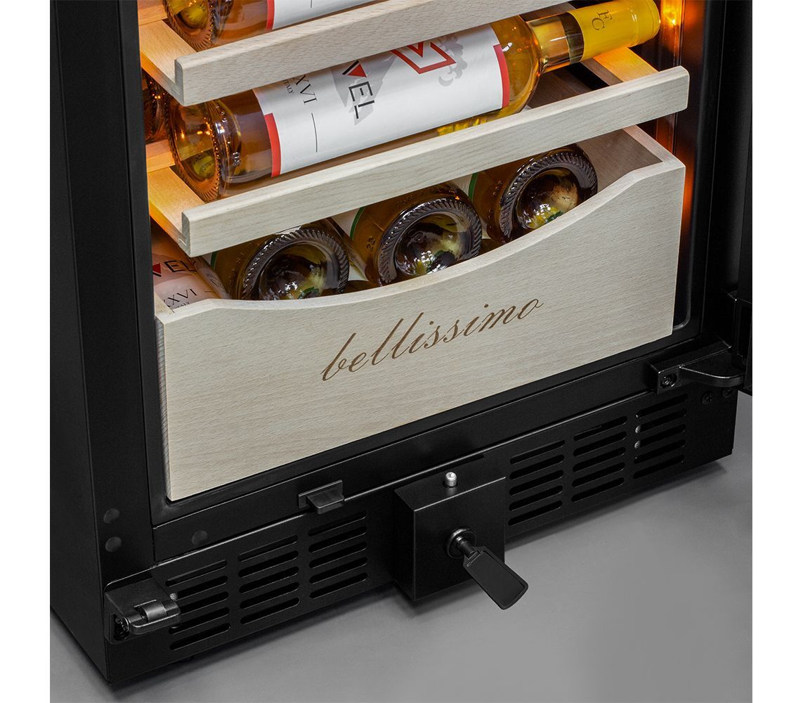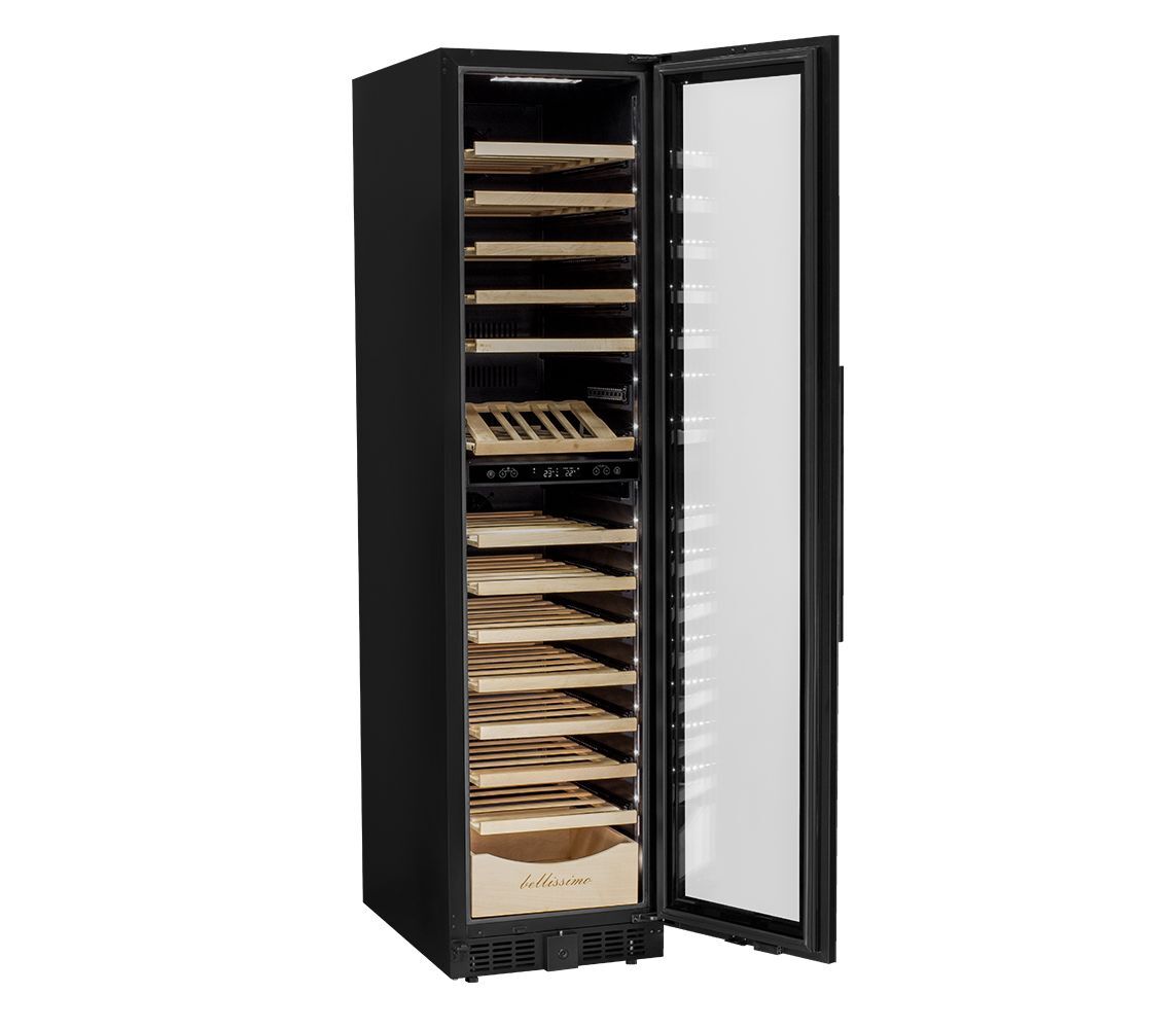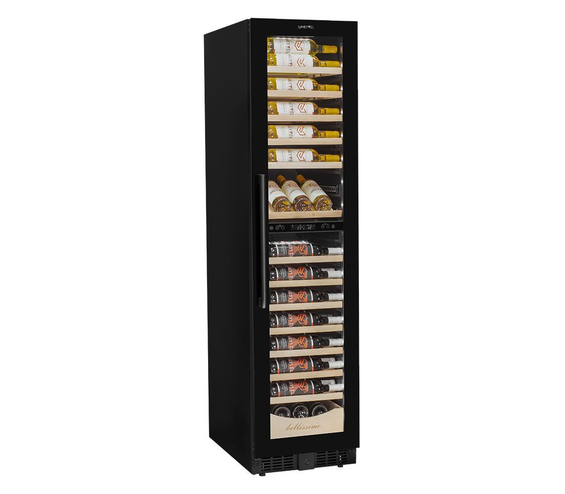 Винный шкаф MEYVEL MV106-KBT2 (Slim) предназначен для демонстрации, хранения и создания оптимальных условий для сохранения всех вкусовых свойств вина в бутылках на предприятиях общественного питания, торговли, в барах, ресторанах, специализированных магазинах, частных домах или квартирах. Модель оснащена сенсорной панелью управления, электронным термостатом и внутренней светодиодной подсветкой. Корпус и дверная ручка выполнены из окрашенной в черный цвет стали, дверь - из тройного стекла с УФ защитой с черной рамкой, полки - из массива бука.