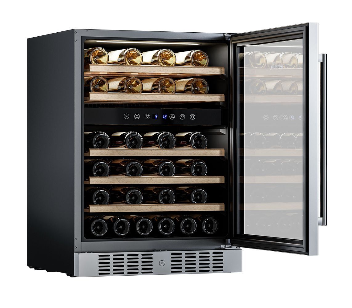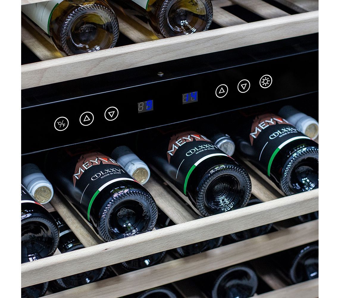 Компрессорный винный шкаф Meyvel MV46-KST2 обладает большой вместимостью и способен разместить до 46 бутылок. Располагаются они на полках из массива бука. Внутреннее пространство шкафа разделено на 2 температурные зоны с возможностью настраивать каждую из них (верхняя зона имеет диапазон от +5℃ до +10℃, а нижняя - от +10℃ до +18℃). Холодильник поддерживает влажность в диапазоне 60-80%, как в настоящем винном погребе.