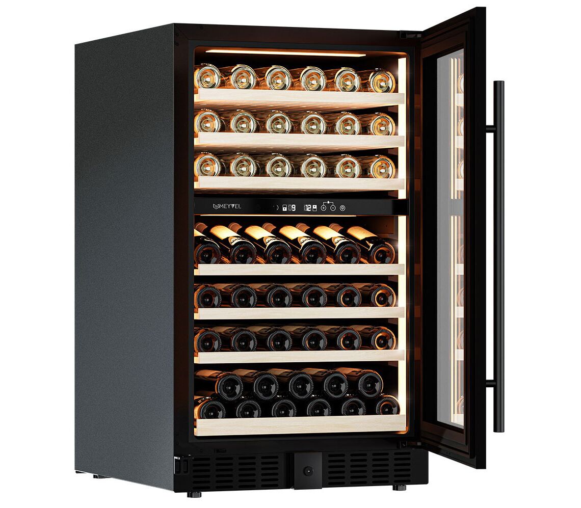 Компрессорный винный шкаф Meyvel MV77PRO-KBT2 обладает большой вместимостью и способен разместить до 77 бутылок. Располагаются они на полках из массива бука. Внутреннее пространство шкафа разделено на 2 температурные зоны с возможностью настройки в диапазоне от + 5°C до +20°C. Холодильник поддерживает влажность в диапазоне 60-80%, как в настоящем винном погребе.